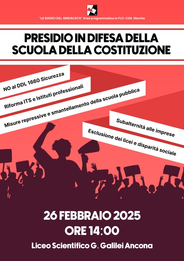 Radici del Sindacato nella FLC delle Marche, area congressuale nella CGIL, esprime ferma opposizione alla visita del Ministro dell’Istruzione e del Merito Giuseppe Valditara, in programma il 26 Febbraio 2025 presso il Liceo Galilei di Ancona nell’ambito della iniziativa “Il futuro della tradizione”.